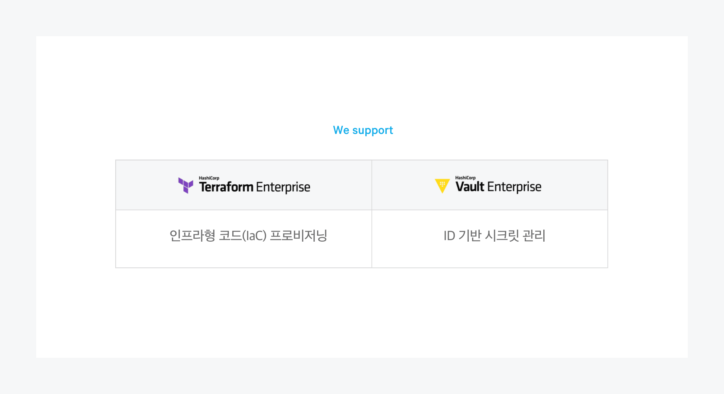 | HashiCorp Platform Enterprise Professional Services | ㆍ Vault, Terraform, Consul, Nomad 초기 설치 및 환경 설정 ㆍ 환경 분석, 설계, 구축, 검증 단계별 기술지원 ㆍ 솔루션 운영에 필요한 사용자 기술지원 ㆍ 제품 운영 및 사용을 위한 운영자/사용자 교육 ㆍ 현장 기술지원(On-site) | 3개월이내 | 3일 | ₩7,000,000 | 1개월 이상 별도협의 | ||